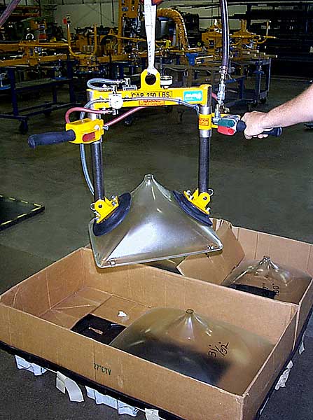 VM和VB系列真空吸吊機(jī)是高度集成的單人操作真空搬運(yùn)輔助系統(tǒng), 適用于透氣、半透氣和不透氣物體。 依靠真空吸盤來吸附物體, 通過電動或氣動葫蘆來提升物體。 系統(tǒng)操作簡單, 安全可靠。VH系列真空吸吊機(jī)具有以下特點(diǎn): 故障率低, 維護(hù)簡單 集成設(shè)計(jì), 最大提升高度2.8米, 最大提升重量500公斤 操作簡單, 通過控制面板來上升、下降和釋放 持續(xù)吸附, 真空泵持續(xù)工作, 物體可長時間被吸附。 頂部空間小, 僅需要73厘米頂部空間 可選用雙速或無極變速電動葫蘆 多功能, 根據(jù)不同物體可更換不同吸盤 應(yīng)用廣泛, 不管什么物體, 透氣、半透氣、不透氣物體都可應(yīng)用